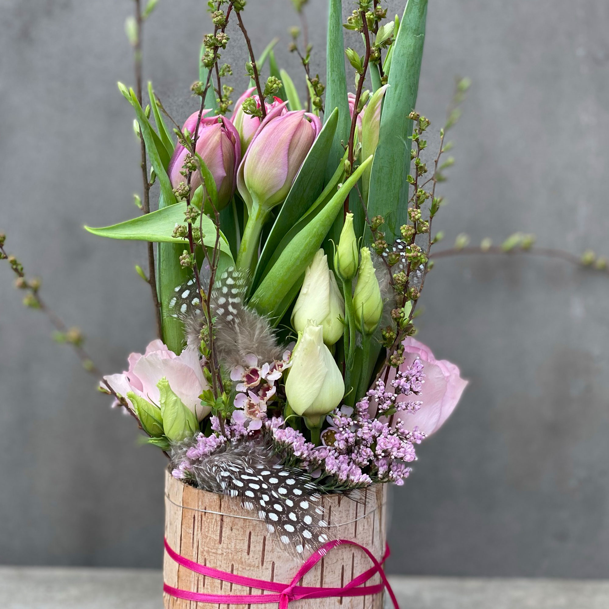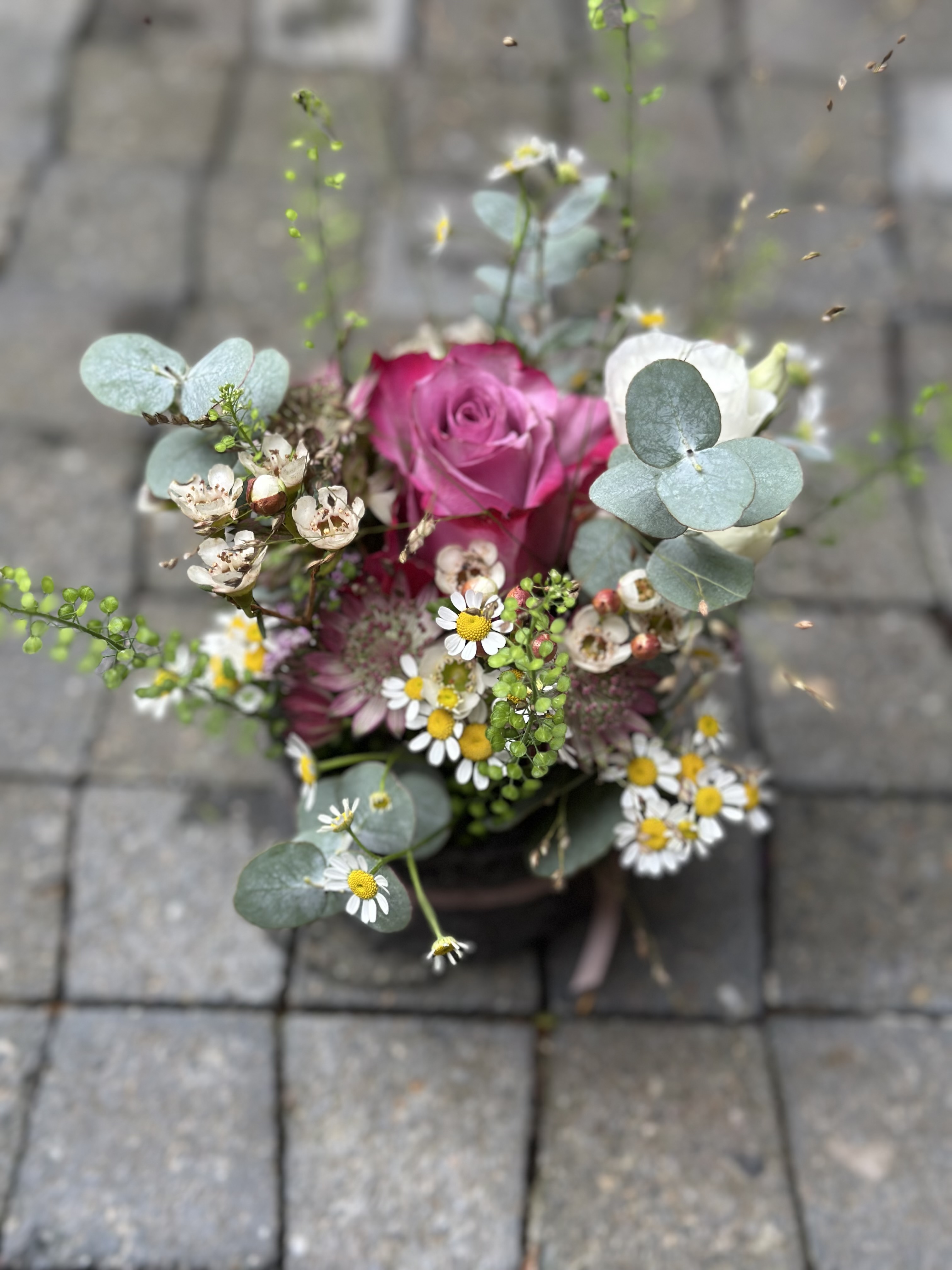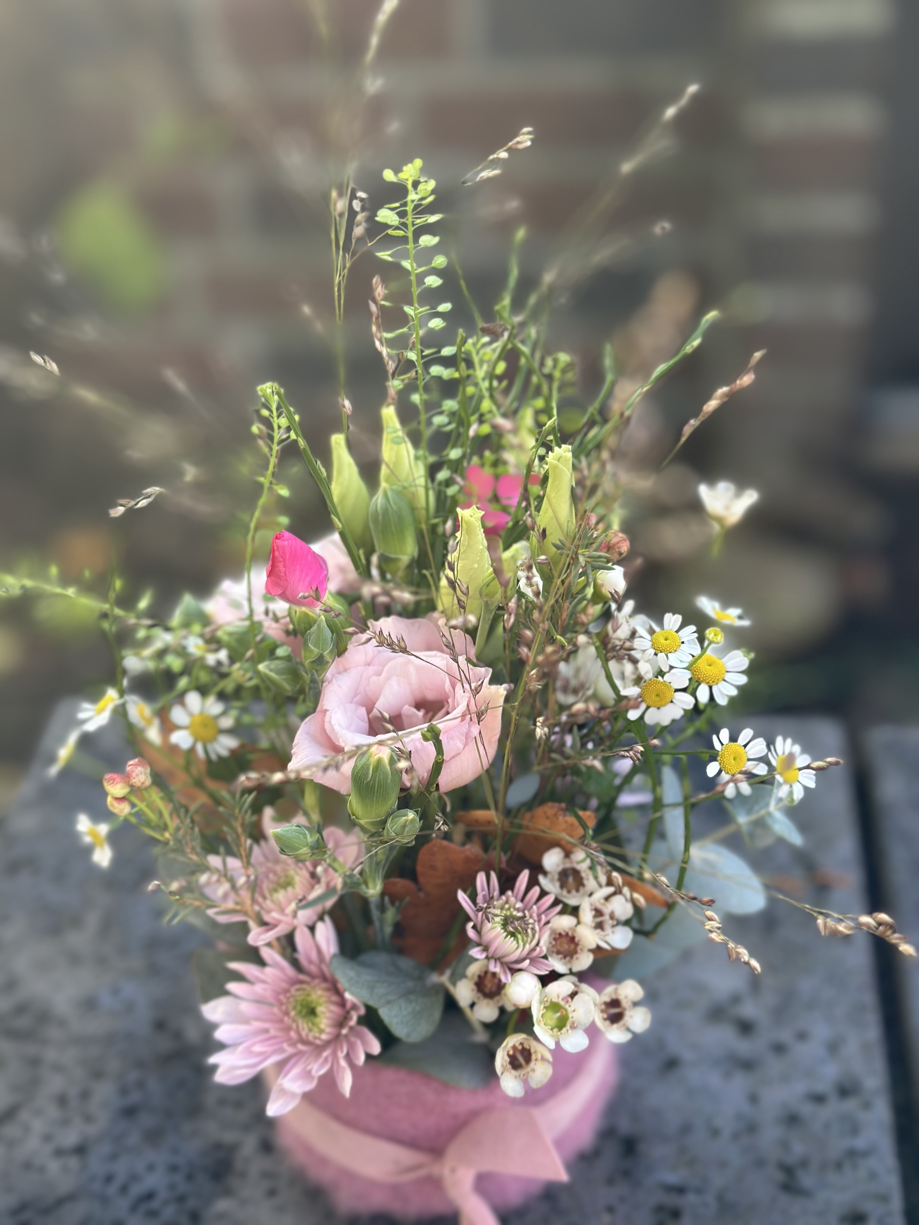 Mein „Petit Fleur” ist ein kleines rundes Blumengesteck (ca. 8 cm Durchmesser). Es wird von außen ummantelt, mal mit Birkenrinde, mal mit Filzband. Ich stecke es nach der wöchentlich wechselnden Blumenauswahl: kompakt ca. 10-12 cm hoch, mal etwas lockerer ca. 15-18 cm hoch.